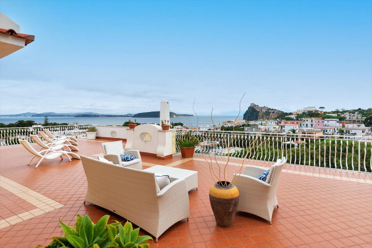 105, con servizi privati, phon, telefono, tv sat, frigobar, balcone o terrazzo, radio, aria condizionata (15/06 - 15/09), cassaforte, alcune con connessione Wi-Fi. Si suddividono in: garden, ubicate nel giardino con accesso tramite scale (non servite da ascensore); comfort, con vista sul parco e/o sulle piscine esterne (servite da ascensore); comfort lato mare, ai piani alti con vista su Ischia Ponte, Vivara e Procida; deluxe, nel corpo centrale, con balcone lato mare o con vista Castello Aragonese; junior suite, nel corpo centrale, più ampie, con angolo salotto e vista sul Castello Aragonese e sul mare.